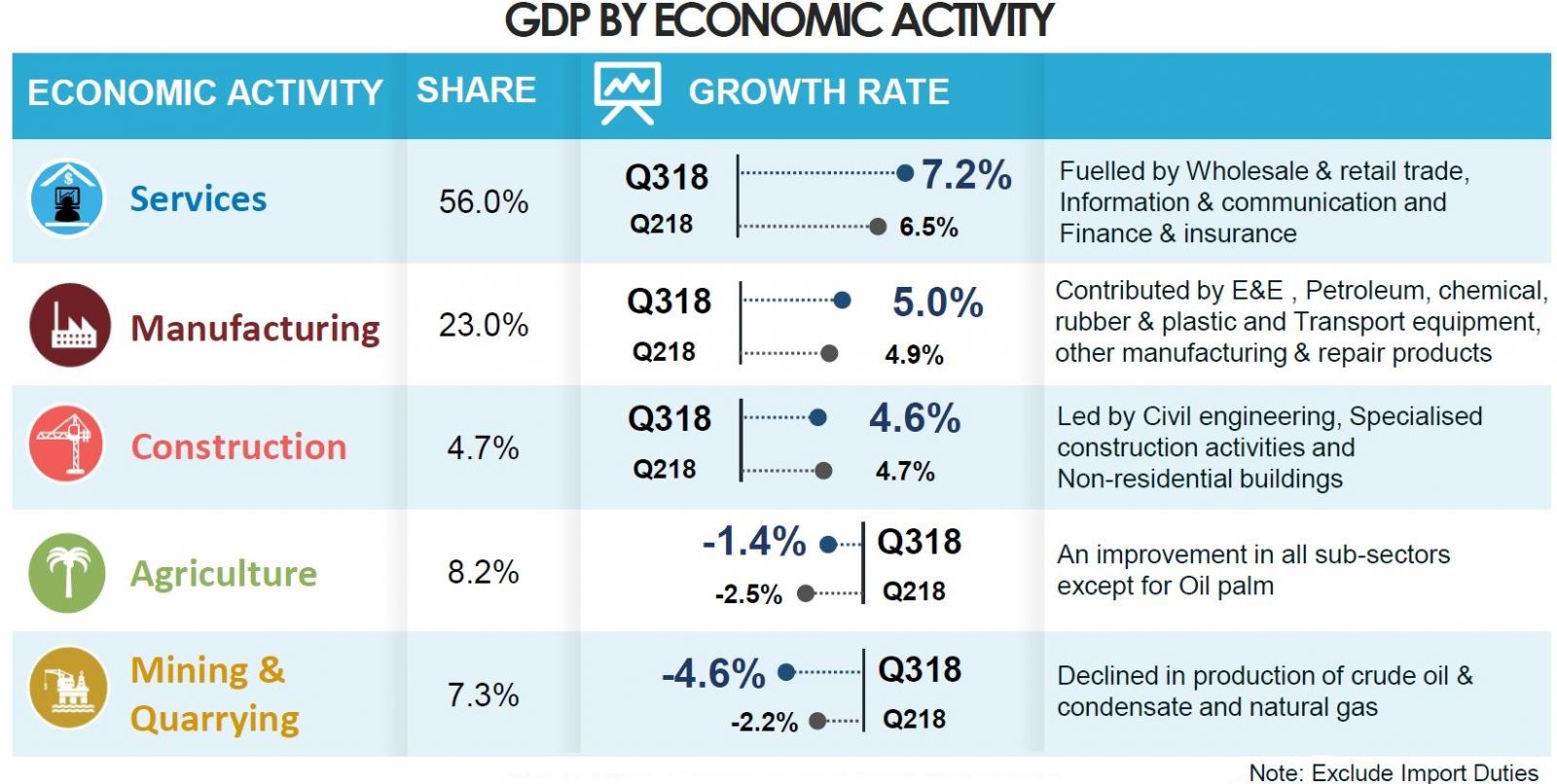 Manufacturing sector increased 5.0 per cent from 4.9 per cent in the previous quarter. The growth was mainly contributed by Electrical, electronic & optical products which strengthened to 6.4 per cent. Petroleum, chemical, rubber & plastic products registered a growth of 3.9 per cent supported by refined petroleum, rubber and plastic products. In addition, the overall performance of Manufacturing sector was also spurred by Transport equipment, other manufacturing & repair which increased to 8.0 per cent.