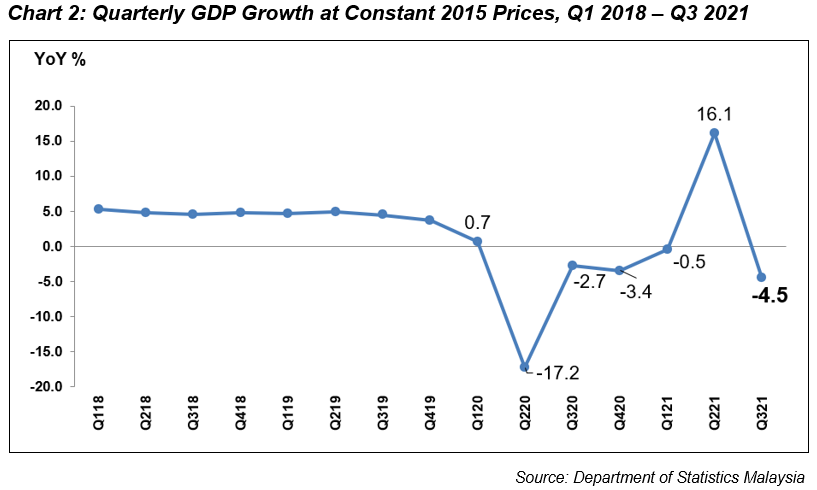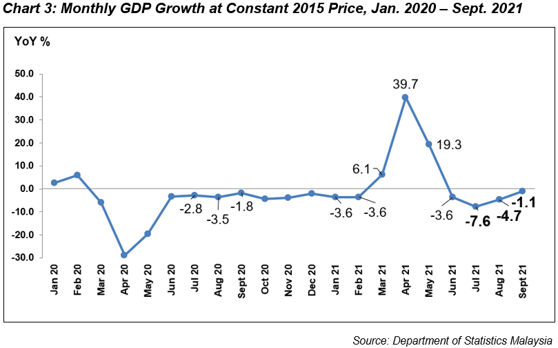 Malaysia’s GDP in the third quarter of 2021 showed a decrease of 4.5 per cent while the quarter-on-quarter seasonally adjusted GDP contracted 3.6 per cent (Q2 2021: -1.9%). Correspondingly, the nation monthly economic performance gradually improved from a contraction of 7.6 per cent in July to a decline of 4.7 per cent in August and further improved to negative 1.1 per cent in September 2021. Approaching year end, Malaysia’s economy grew 3.0 per cent for the sum of three quarters of 2021 (3Qs 2020: -6.4%).
