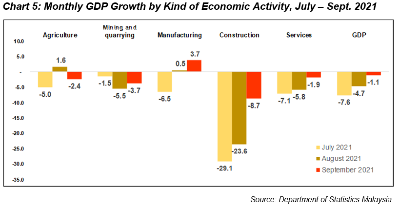 The Manufacturing sector posted a marginal decline of 0.8 per cent (Q2 2021: 26.6%) in the third quarter of 2021. On a quarter-on-quarter seasonally adjusted, this sector fell 1.8 per cent. The decline of Manufacturing sector was affected by the Transport equipment, other manufacturing and repair (-29.6%) and Non-metallic mineral products, basic metal & fabricated metal products (-14.0%). However, Petroleum, chemical, rubber & plastic products (12.6%) and Electrical, electronic & optical products (7.1%) grew at a slower pace in line with the moderate growth in exports of goods recorded in this quarter.