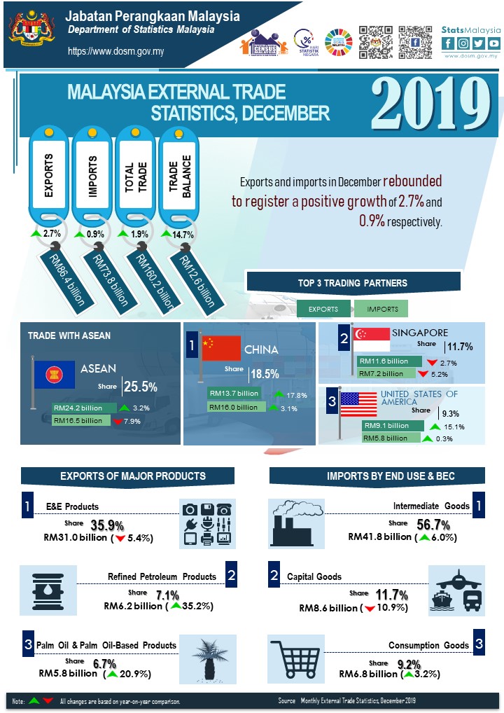 - In 2019, Malaysia’s exports amounted to RM986.4 billion with a decline of 1.7% as compared to last year, while imports worth RM849.0 billion (-3.5%) resulting in a total trade of RM1.8 trillion (-2.5%).