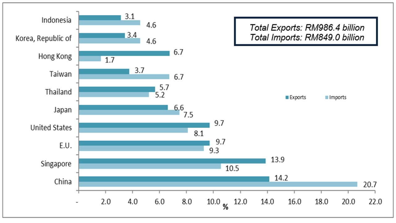 - On a y-o-y basis, exports grew due to the increase in exports to China (+RM2.1 billion), the United States (+RM1.2 billion), Indonesia (+RM979.4 million), Taiwan (+RM721.6 million) and Viet Nam (+RM353.3 million). However, exports decreased to Hong Kong (-RM1.2 billion) and Japan (-RM855.5 million).