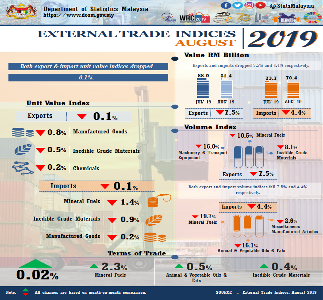 On a month-on-month basis, in August 2019, the export unit value index recorded a marginal decline of 0.1% to 115.3 points which was mainly attributed to the decrease in the index of manufactured goods (-0.8%), inedible crude materials (-0.5%) and chemicals (-0.2%). Meanwhile, the export volume index also recorded the same trend with a drop of 7.5% to 132.6 points. The drop was led by the decrease in the index of machinery & transport equipment (-16.0%), mineral fuels (-10.5%) and inedible crude materials (-8.1%). In seasonally adjusted terms, the export volume index decreased 10.6% to 128.3 points.