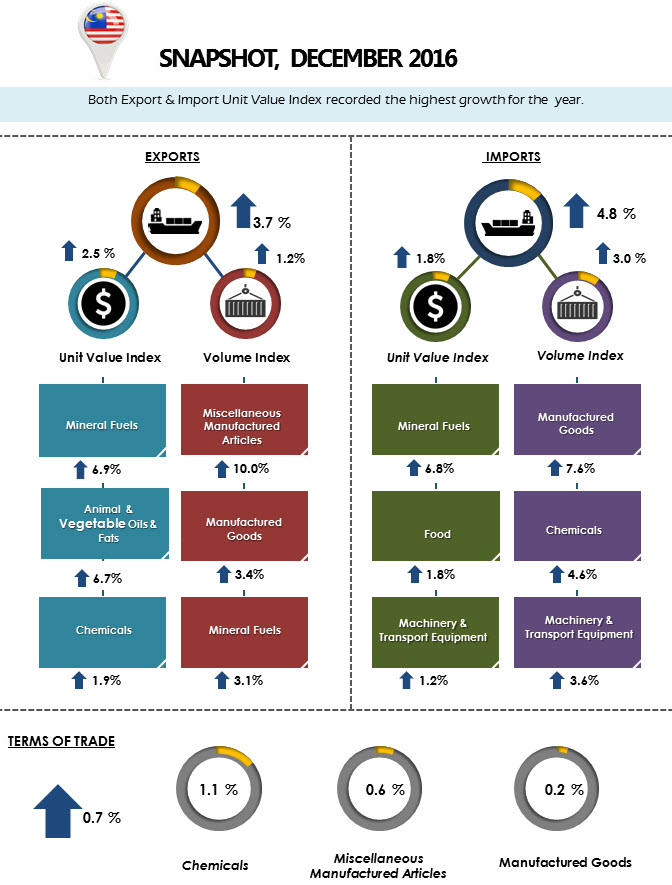 In December 2016, Malaysia’s terms of trade recorded an increase of 0.7% to 97.1 points when compared with the preceding month, while a reduction of 1.3% was recorded year-on-year.