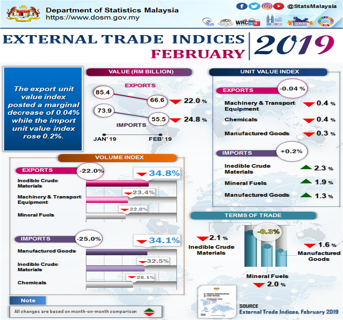 On a month-on-month (m-o-m) basis, in February 2019, the export unit value index recorded a marginal decrease of 0.04% to 114.0 points which was mainly attributed to a decrease in the index of machinery & transport equipmen t (-0.4%), chemicals (-0.4%) and manufactured goods (-0.3%). Meanwhile, the export volume index fell 22.0% to 109.8 points which was led by the index of inedible crude materials (-34.8%), machinery & transport equipment (-23.4%) and mineral fuels (-22.0%). In seasonally adjusted terms, the export volume index dropped 13.9% to 123.2 points.