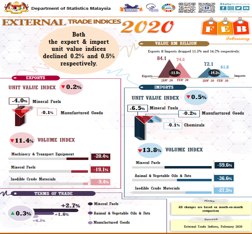 Malaysia’s terms of trade expanded 0.3% to 100.2 points when compared with January 2020. On a year-on-year basis, Malaysia’s terms of trade also registered a rise of 2.2% from 98.0 points.