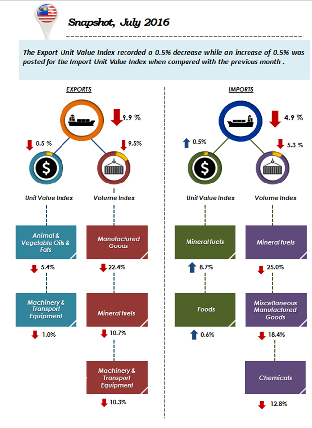 In July 2016, Malaysia’s terms of trade decreased 1.0% to 95.2 points when compared with the preceding month, while a reduction of 3.9% was recorded year-on-year.