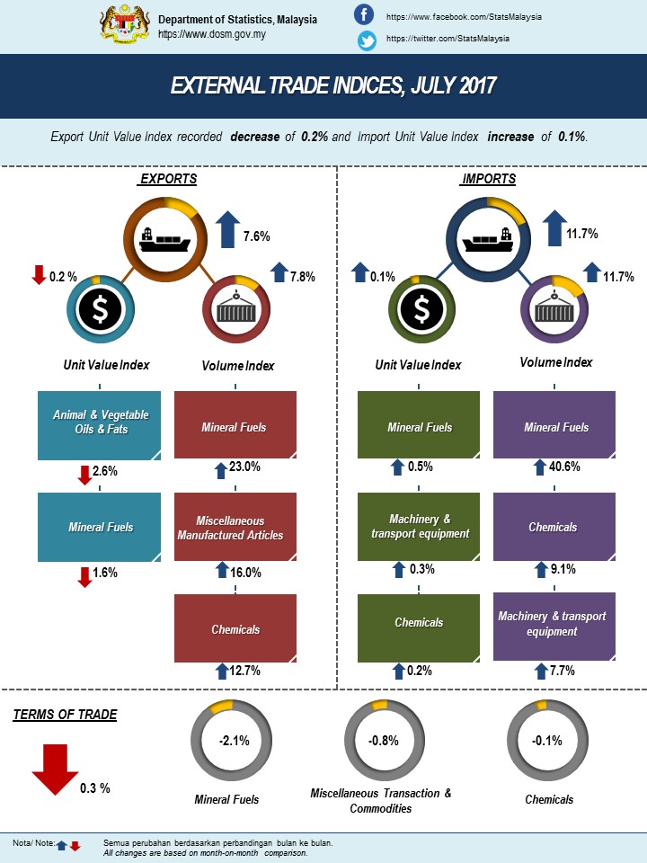 On a month-on-month (m-o-m) basis, in July 2017, the export unit value index declined by 0.2% to 111.4 points. This was mainly attributed to animal & vegetable oils & fats (-2.6%) and mineral fuels (-1.6%). Meanwhile, the export volume index recorded increased 7.8% to 132.7 points which was led by mineral fuels (+23.0%), miscellaneous manufactured articles (+16.0%) and chemicals (+12.7%).In seasonally adjusted terms, the export volume index registered an increase of 10.4%.