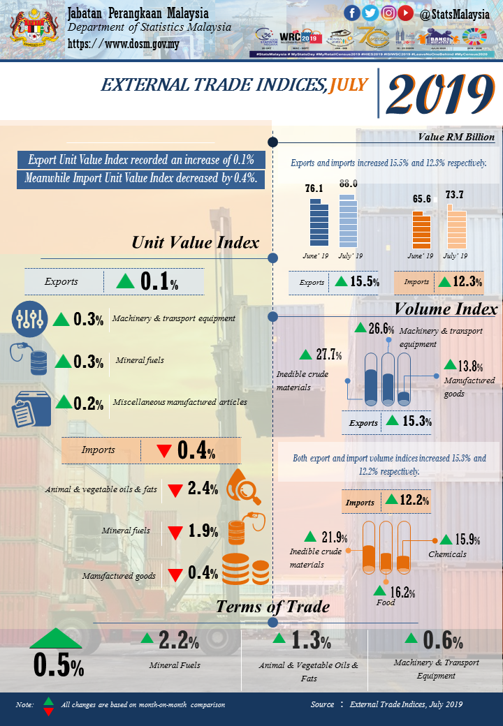 On a month-on-month basis, in July 2019, the export unit value index recorded an increase of 0.1% to 115.4 points which was mainly attributed to the increase in the index of machinery & transport equipment (+0.3%), mineral fuels (+0.3%) and miscellaneous manufactured articles (+0.2%). The export volume index registered an increase of 15.3% to 143.3 points. The increase was led by the index of inedible crude materials (+27.7%), machinery & transport equipment (+26.6%) and manufactured goods (+13.8%). In seasonally adjusted terms, the export volume index increased by 10.7% to 143.5 points.