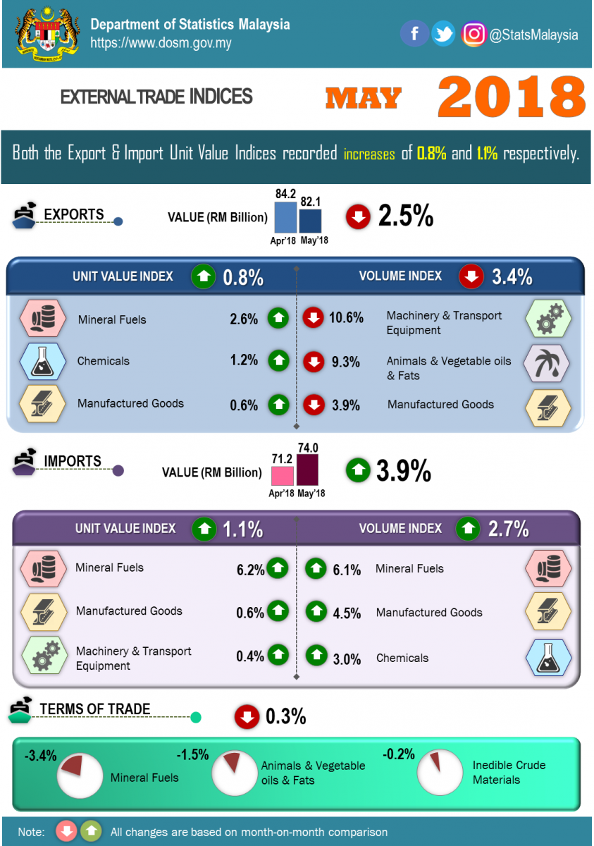In May 2018, the import unit value index also increased by 1.1% to 116.8 points which was mainly led by mineral fuels (+6.2%) followed by manufactured goods (+0.6%) and machinery & transport equipment (+0.4%).The import volume index recorded an increase of 2.7% to 143.8 points. This was mainly attributed to mineral fuels (+6.1%), manufactured goods (+4.5%) and chemicals (+3.0%). In seasonally adjusted terms, the import volume index in May 2018 dropped 4.2% to 140.9 points.