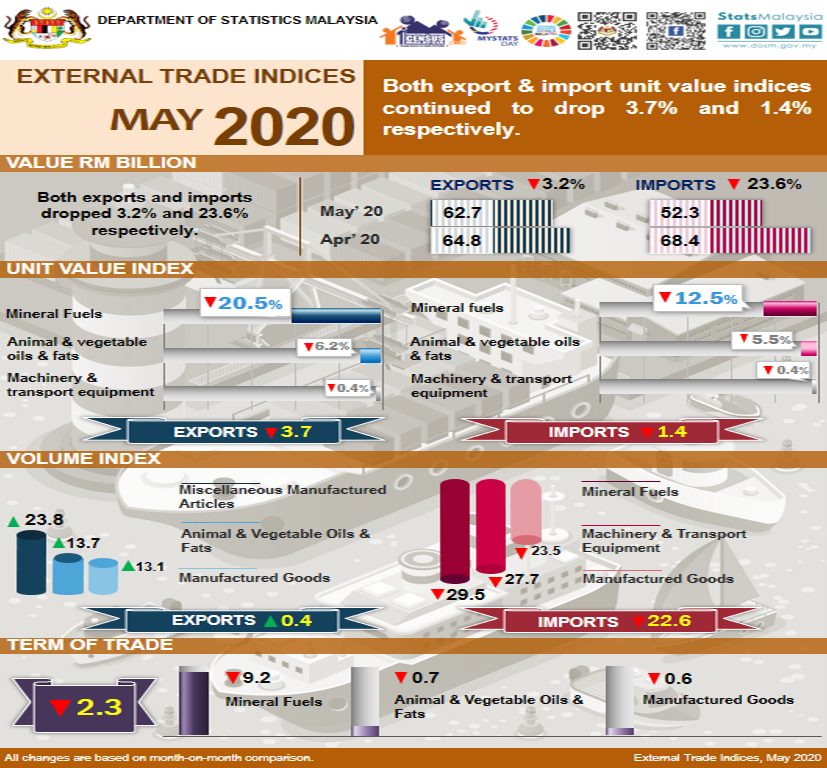 Malaysia’s terms of trade dropped 2.3% to 97.1 points as compared with April 2020. On a year-on-year basis, Malaysia’s terms of trade registered a marginal growth of 0.2% from 96.9 points.
