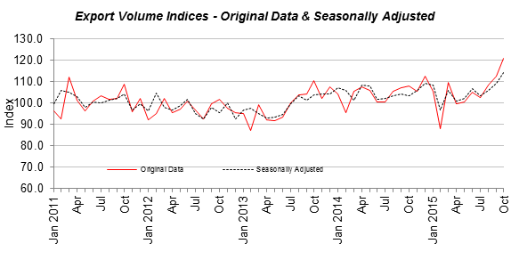 In seasonally adjusted terms, the export volume index in October 2015 rose 4.3% to 114.1 points.
