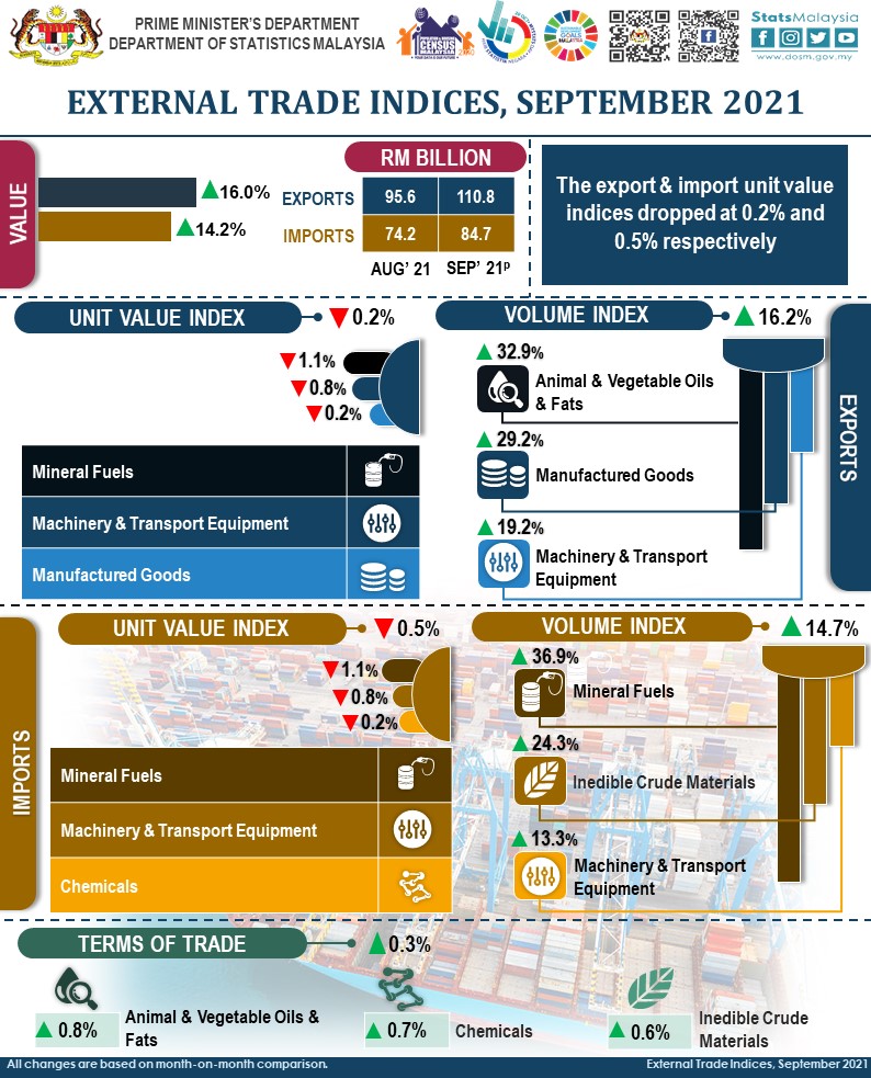 The full publication of the External Trade Indices, September 2021 can be downloaded through eStatistik Portal.