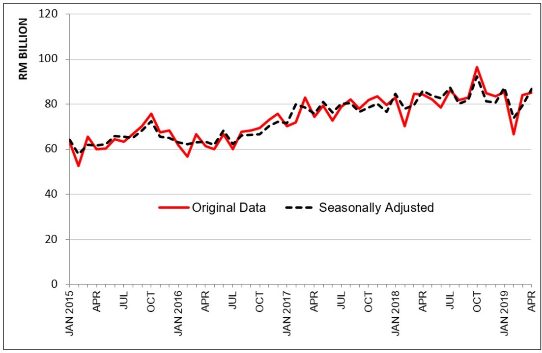 Total trade which was valued at RM159.5 billion increased RM4.1 billion or 2.6% in April 2019. It is also posted a growth of RM5.8 billion or 3.8% when compared to the previous month. The trade surplus shrank RM2.2 billion (-16.6%) from a year ago and RM3.5 billion (-24.5%) from the previous month respectively to RM10.9 billion.