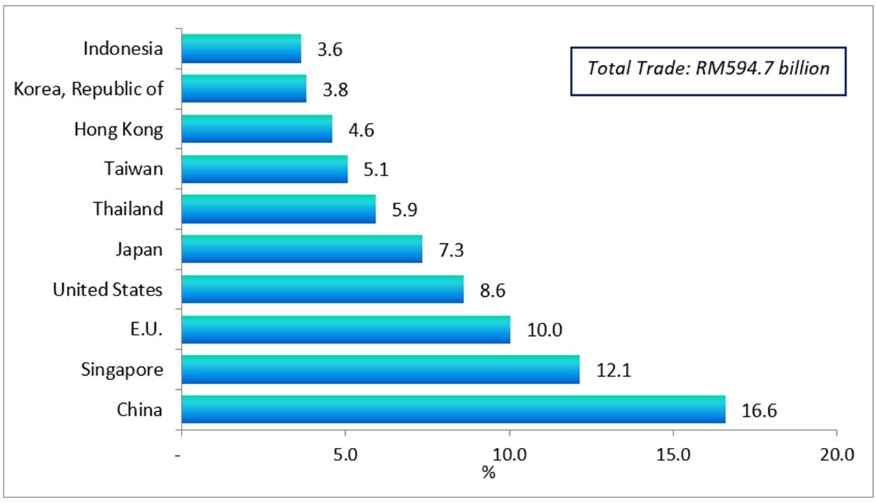 Exports to China which were valued at RM11.5 billion declined RM857.1 million (-6.9%). The main product which attributed to the decrease was E&E products, which contributed 37.2% of total exports shrank RM892.7 million (-17.2%) to RM4.3 billion.