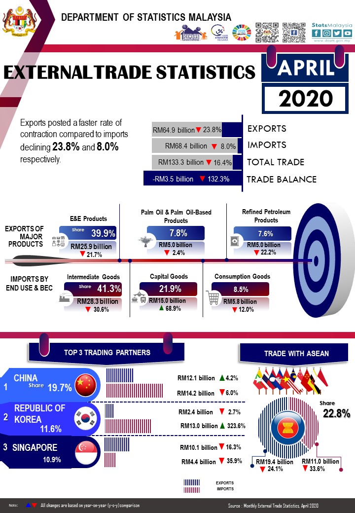 Total trade which was valued at RM133.3 billion decreased RM26.2 billion or 16.4% compared to April 2019. It also posted a decrease of RM14.6 billion or 9.9% when compared to March 2020. The trade deficit in April 2020 was valued at RM3.5 billion. This was the first month of trade deficit since October 1997.