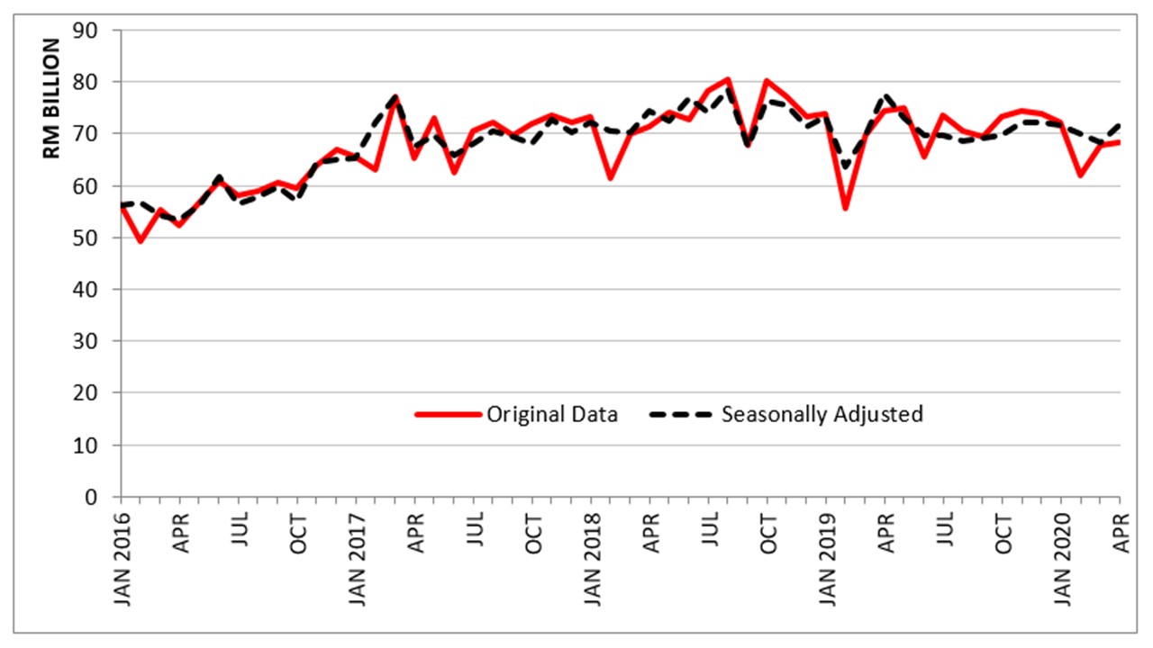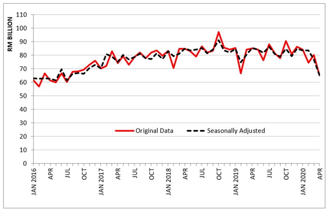 - On a month-on-month (m-o-m) basis, exports declined 19.0% from RM80.1 billion. In seasonally adjusted terms, exports shrank 15.4%.