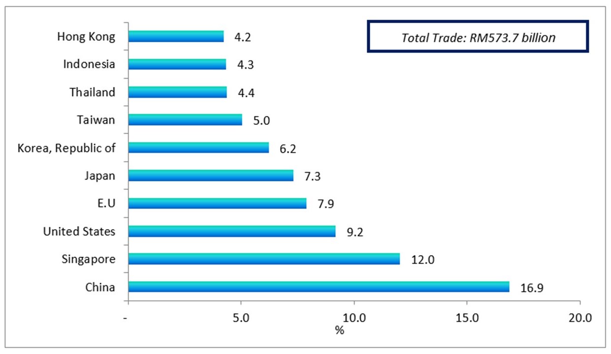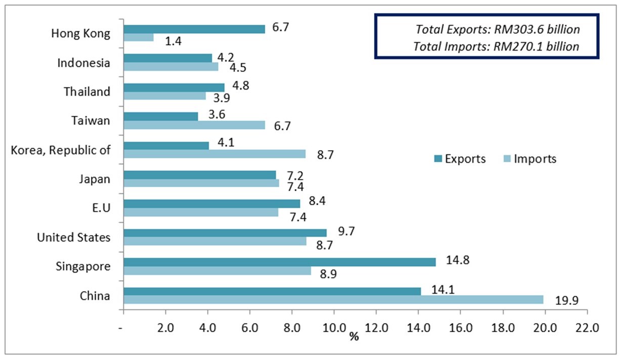 (-RM2.3 billion), Singapore (-RM2.0 billion) and Thailand (-RM2.0 billion). However, exports increased to China (+RM488.1 million). - On a y-o-y basis, lower imports were mainly from Singapore (-RM2.5 billion), the European Union (-RM2.1 billion), Thailand (-RM1.7 billion), Saudi Arabia (-RM1.6 billion) and Japan (-RM906.9 million). Meanwhile, higher imports were from Republic of Korea (+RM9.9 billion).