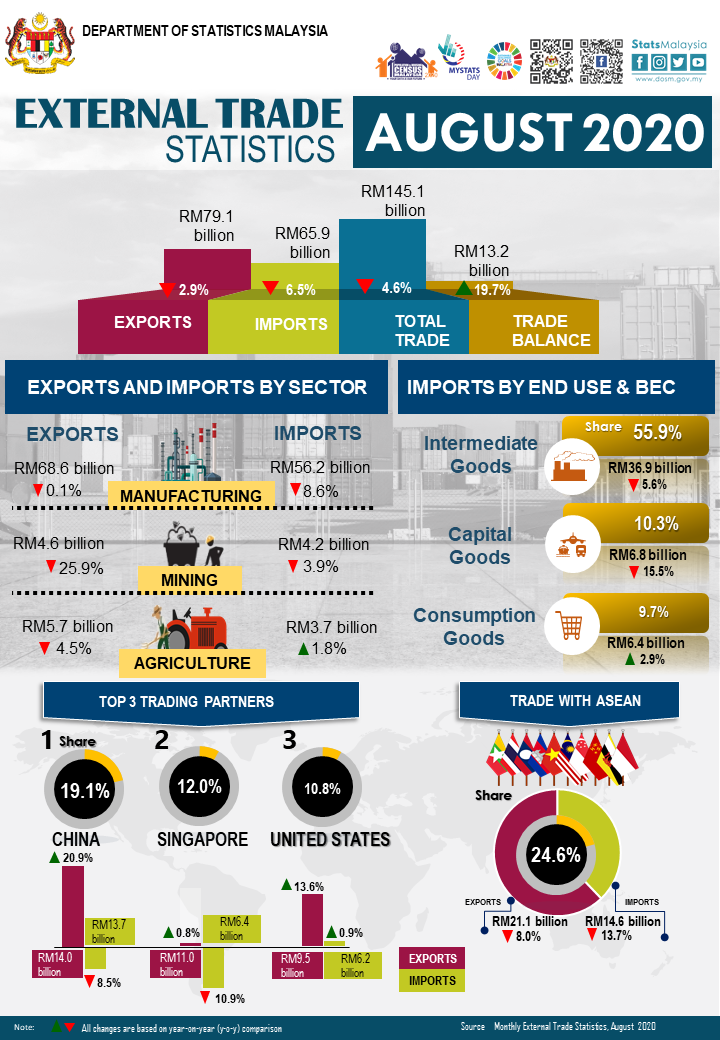 Malaysia’s exports in August 2020 slipped by 2.9 per cent year-on-year (y-o-y) to RM79.1 billion, while imports amounted to RM65.9 billion, a contraction of 6.5 per cent. This has resulted in a trade surplus of RM13.2 billion in August 2020, a growth of 19.7 per cent y-o-y. Total trade was valued at RM145.1 billion, lower by 4.6 per cent y-o-y.