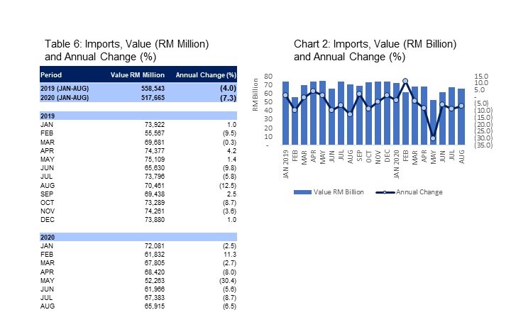 - In January to August 2020, Malaysia’s imports contracted by 7.3 per cent to RM517.7 billion compared to the same period in 2019.