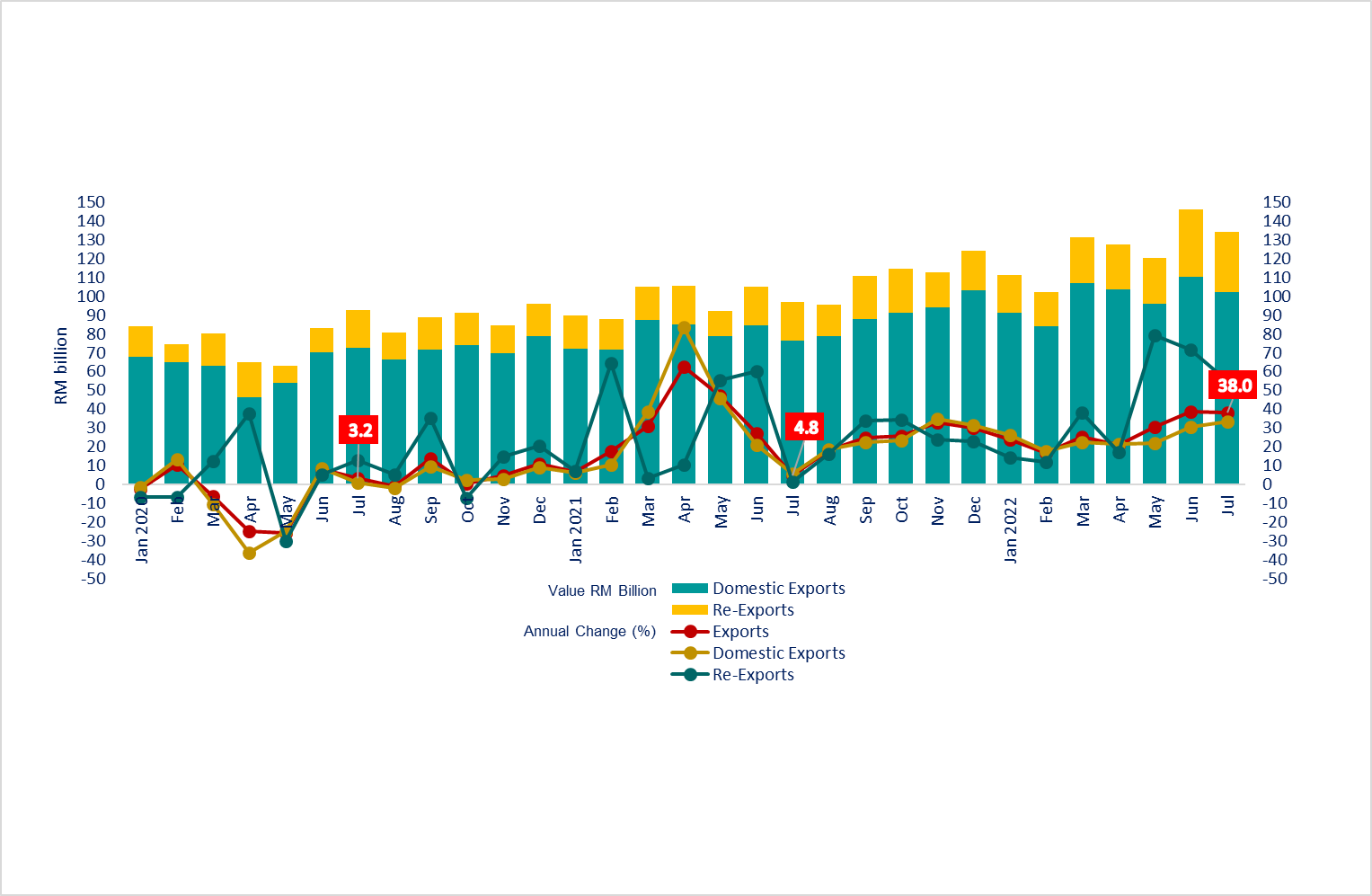 Chart 1: Domestic Exports, Re-Exports (RM billion) and Annual Change (%)