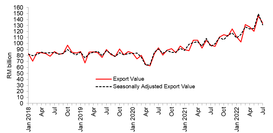 Malaysia’s exports was recorded at RM134.1 billion, increased by 38.0 per cent as compared to July 2021. The increase was driven by both domestic exports and re-exports. Domestic exports stood at RM102.1 billion and contributed 76.2 per cent to total exports, grew by 33.4 per cent. On the same note, re-exports with a value of RM32.0 billion, increased by 55.1 per cent y-o-y. Meanwhile, for monthly comparison, exports fell by 8.2 per cent or RM12.0 billion. Analysis of the seasonally adjusted terms month-on-month (m-o-m), exports decreased by 12.4 per cent or RM18.5 billion to reach RM134.1 billion.