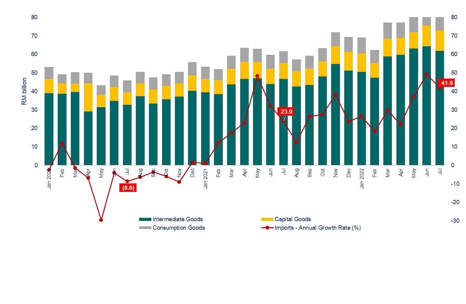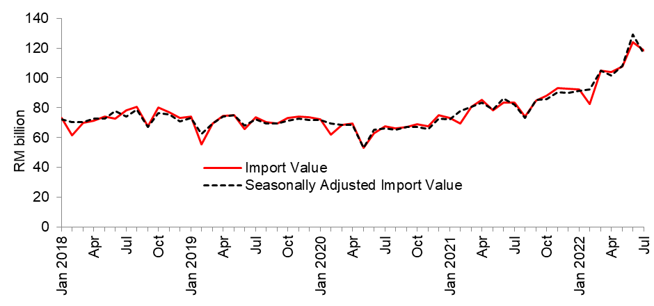Import growth continued to outpace export growth in July 2022, grew 41.9 per cent or RM35.0 billion to RM118.6 billion. On a m-o-m basis, imports dropped by 4.5 per cent or RM5.6 billion. Analysis of the seasonally adjusted terms m-o-m, imports decreased by 10.0 per cent to RM118.6 billion.