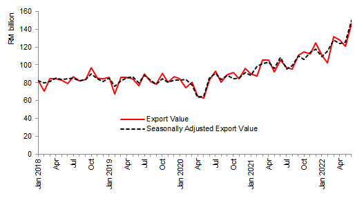 Malaysia’s exports remained strong with a new high value of RM146.2 billion, went up by 38.8 per cent in June 2022. The performance was driven by increases in domestic exports 30.6 per cent and accelerated growth of re-exports with 72.2 per cent. Domestic exports dominated total exports with an amount of RM110.6 billion and thus contributed 75.7 per cent, while re-exports totalled RM35.6 billion with a share of 24.3 per cent. On the other hand, exports recorded an increase of 21.3 per cent as compared to May 2022. Analysis of the seasonally adjusted terms month-on-month (m-o-m), exports rose by 19.5 per cent (+RM24.4 billion) to RM149.8 billion.