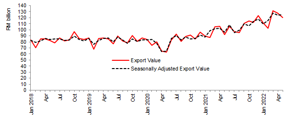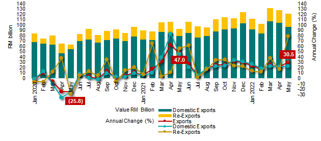 Malaysia’s exports in May 2022 widened to RM120.5 billion, registering a double-digit growth of 30.5 per cent year-on-year (y-o-y) and maintained the positive growth for 21st consecutive months since September 2020. Export value growth in May 2022 was supported by both, domestic exports and re-exports. Domestic exports was valued at RM96.0 billion contributed 79.7 per cent to total exports, grew by 22.1 per cent, y-o-y. Meanwhile, re-exports registered RM24.4 billion, increased by 79.1 per cent as compared to the previous year. In comparison to April 2022, exports posted a decrease of 5.6 per cent or RM7.1 billion. Analysis of the seasonally adjusted terms m-o-m, exports rose by 1.1 per cent or RM1.3 billion to RM125.4 billion.