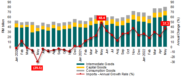 Malaysia’s imports recorded all-time high at RM107.9 billion in May 2022, expanded by 37.3 per cent as compare to the same month previous year. In comparison to April 2022, imports also posted an increase of 3.6 per cent or RM3.8 billion. Based on seasonally adjusted terms, imports rose 6.5 per cent to RM108.4 billion. On a y-o-y basis, imports by end use registered a positive growth with the increases in the intermediate goods and consumption goods.