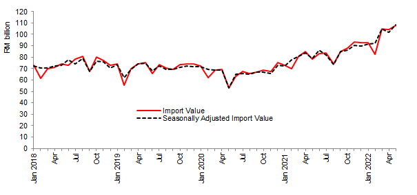 Chart 4: Actual Import Value and Seasonally Adjusted Import Value, RM billion
