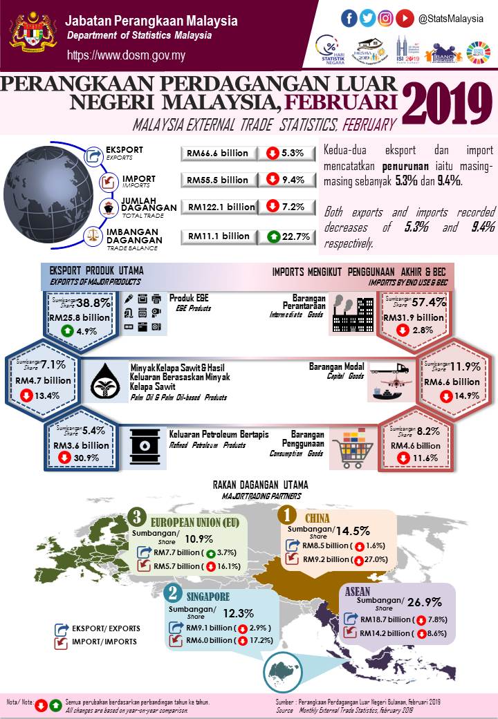 Total trade in February 2019 declined 7.2% to RM122.1 billion from February 2018. It also declined 23.3% or RM37.1 billion as compared to the previous month. The trade surplus was RM11.1 billion, surged 22.7% or RM2.0 billion when compared to the previous year. However, it decreased RM452.5 million (-3.9%) as compared to the previous month.