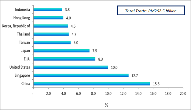 Imports from China amounted to RM9.8 billion, increased RM591.9 million (+6.5%) as compared to the previous year. The main product which attributed to the rise was E&E products (44.1% of total imports), increased RM953.5 million or 28.5% to RM4.3 billion. However, imports of refined petroleum products decreased RM453.7 million or 29.0% to RM1.1 billion.