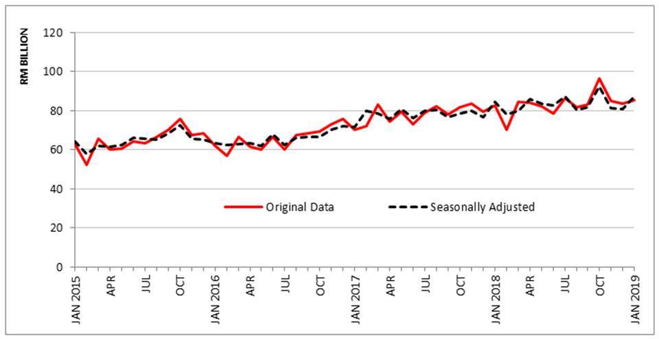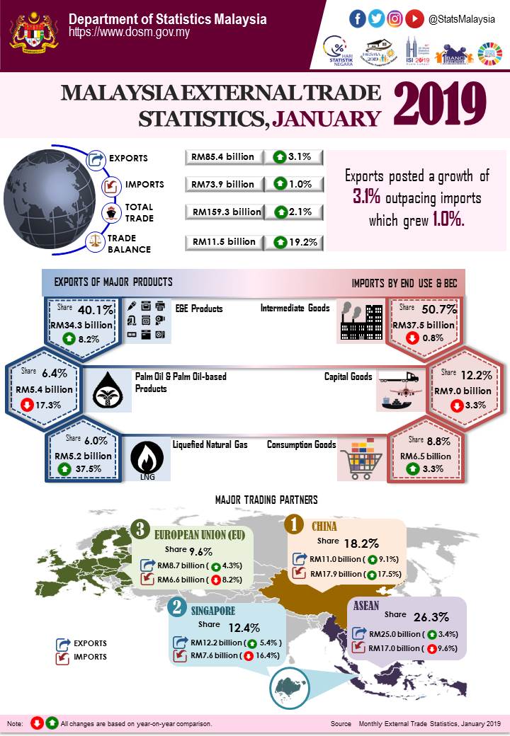 Total trade in January 2019 grew 2.1% to reach RM159.3 billion from January 2018. It also posted a growth of 1.9% or RM2.9 billion when compared to the previous month. The trade surplus was RM11.5 billion, surged 19.2% or RM1.9 billion compared to the previous year. It also registered an increase of RM845.3 million (+7.9%) when compared to the previous month.