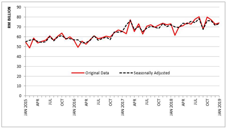 On a m-o-m basis seasonally adjusted terms, imports increased RM1.8 billion (+2.6%) to RM73.2 billion.