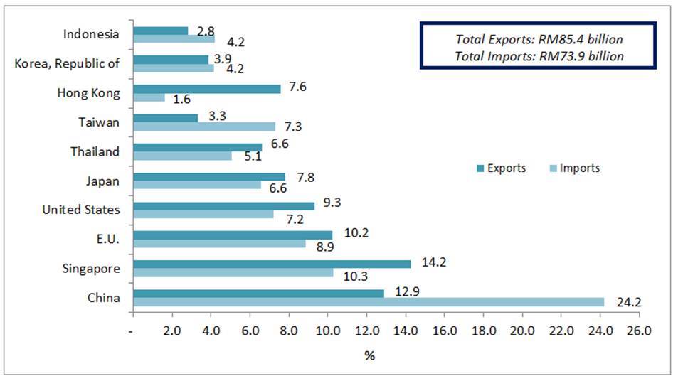 Meanwhile, exports to China increased RM919.4 million (+9.1%) were valued at RM11.0 billion.