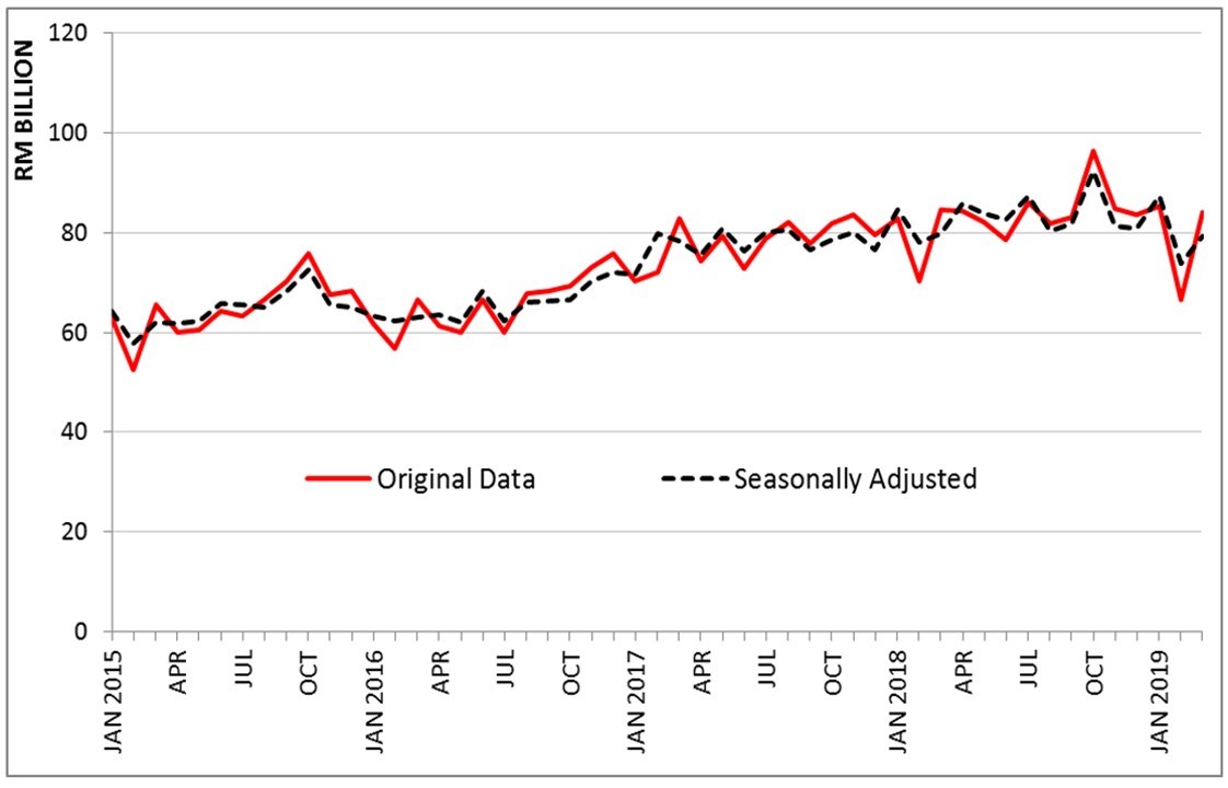 - In March 2019, exports decreased marginally 0.5% to RM84.0 billion year-on-years (y-o-y). Re-exports was valued at RM15.2 billion registering a decline of 5.4% y-o-y and accounted for 18.1% of total exports. Domestic exports recorded an increase of 0.7% or RM446.5 million to RM68.8 billion.