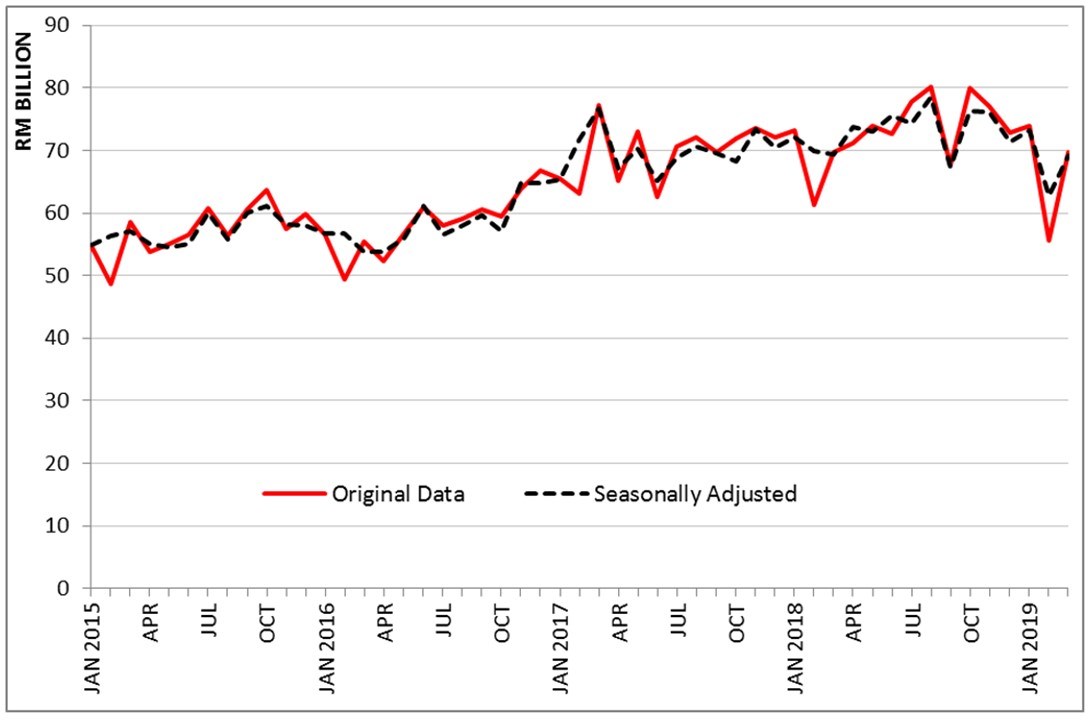 Total trade which was valued at RM153.7 billion decreased RM518.6 million or 0.3% in March 2019. However, it grew RM31.6 billion or 25.9% when compared to February 2019. The trade surplus was RM14.4 billion, shrank RM318.5 million (-2.2%) from a year ago. However, it surged 30.0% or RM3.3 billion as compared to the previous month.
