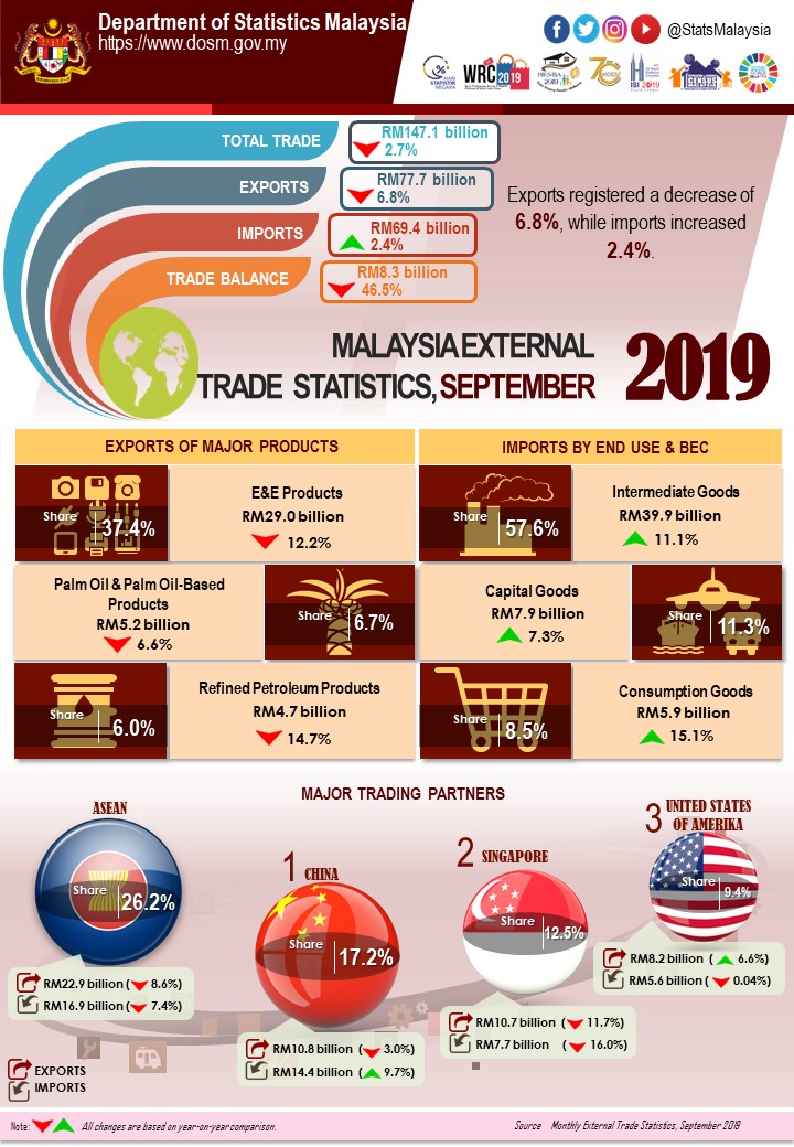 Total trade which was valued at RM147.1 billion decreased RM4.0 billion or 2.7% as compared to September 2018. It also posted a decrease of RM4.7 billion or 3.1% when compared to the previous month. The trade surplus was RM8.3 billion, shrank 46.5% or RM7.2 billion from a year ago. It also dropped 23.5% or RM2.6 billion as compared to the previous month.