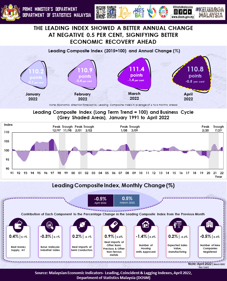 The full publication of the Malaysian Economic Indicators: Leading, Coincident & Lagging Indexes, April 2022 can be downloaded through eStatistik Portal.