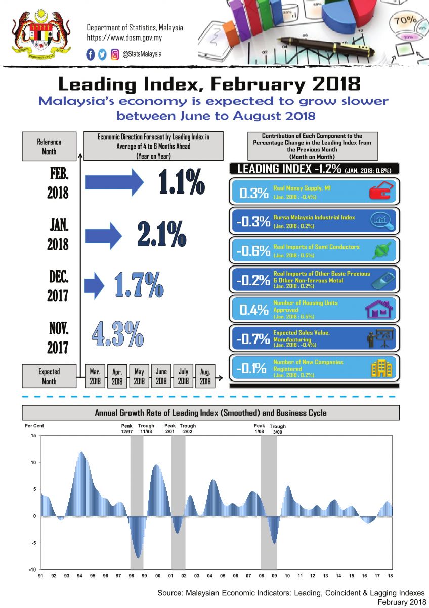 The annual changes of LI and CI were slower than the previous month. Concurrently, the Diffusion Index for CI remained at 66.7% while LI was below 50.0%. Based on this scenario, Malaysia’s economy is expected to grow slower between June to August 2018.
