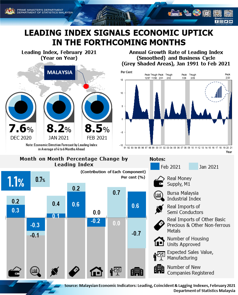 The full publication of the Malaysian Economic Indicators: Leading, Coincident & Lagging Indexes, February 2021 can be downloaded through eStatistik Portal.