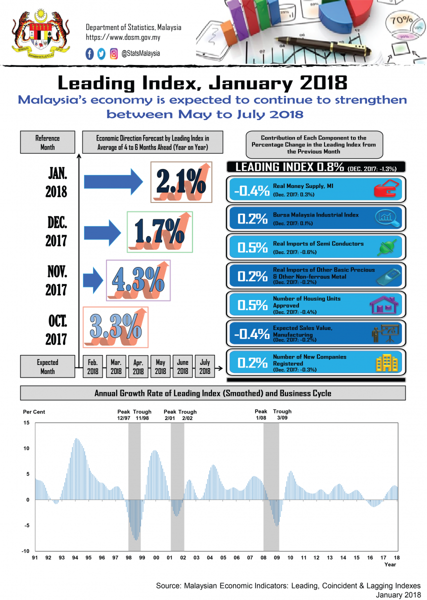 The Leading Index (LI) which monitors the economic performance in advance registered a growth of 0.8% in January 2018 to 120.3 points from 119.3 points in December 2017. Real Imports of Semi Conductors and Number of Housing Units Approved, which recorded 0.5% respectively, were among the components that caused this increase. The annual change of LI rose to 2.1% as compared to 1.7% in the preceding month.
