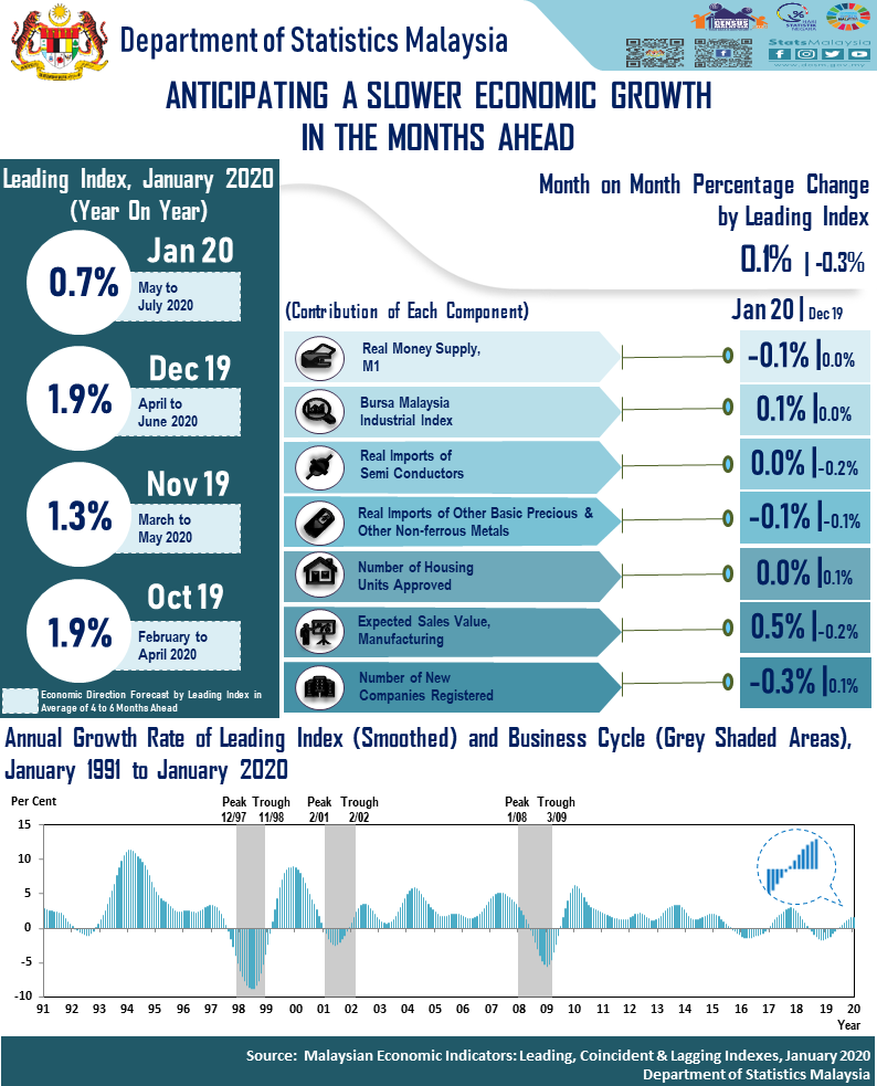 The Leading Index (LI) is a gauge of the economic direction in a few months ahead. The index for reference month January 2020 has not taken into account the internal shocks that have a direct impact on the economy especially the COVID-19 pandemic that plagues Malaysia from 23 January 2020 to date. These pandemic effects are expected to be reflected in the index of subsequent month. The LI increased 0.1 per cent, month on month, in January 2020 from a negative 0.3 per cent in the previous month. Among seven components of LI, two posted rises namely Expected Sales Value in Manufacturing sector (0.5%) and Bursa Malaysia Industrial Index (0.1%). The LI year on year change showed a slower growth by registering 0.7 per cent in the first month of 2020 as compared to 1.9 per cent in December 2019. Therefore, a slower economic growth is anticipated in the months ahead.