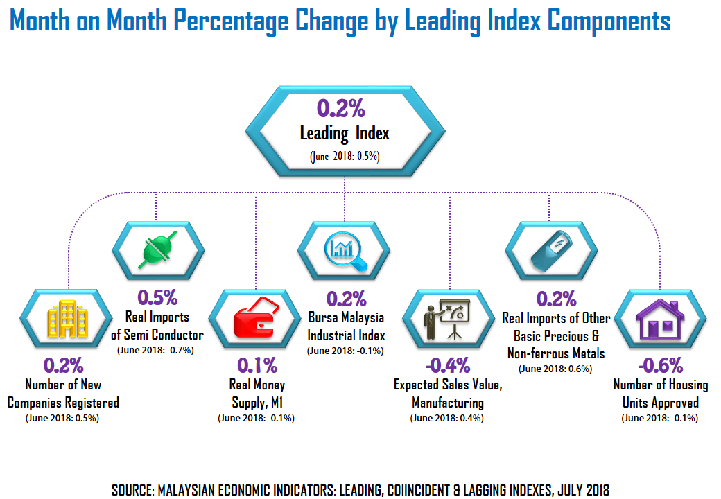 The Malaysia’s economy is expected to continue growing at a slow rate between November 2018 to January 2019 according to the performance of Malaysian Economic Indicators: Leading, Coincident & Lagging Indexes for July 2018. The monthly change of Leading Index (LI) increased 0.2 per cent in July 2018. The LI was recorded at 118.6 points in the reference month as compared to 118.4 points in June 2018. Five out of seven components of LI make up the increased with the highest contribution by Real Imports of Semi Conductors (0.5%). In contrast, the annual change of LI decreased slightly, negative 0.1 per cent in July 2018. The LI is designed to monitor the economic performance for an average of four to six months ahead.