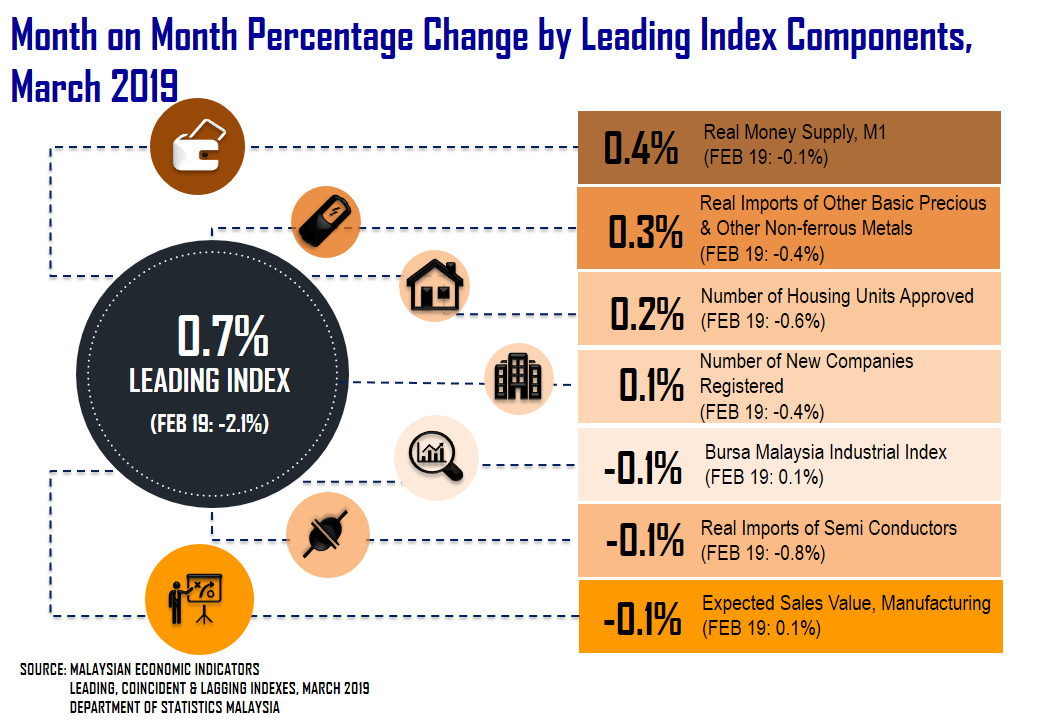 According to the Malaysian Economic Indicators: Leading, Coincident & Lagging Indexes for the reference month of March 2019, Malaysia’s economic growth is anticipated to ease in July to September 2019. The monthly change of Leading Index (LI) augmented in March 2019, posting a growth of 0.7 per cent to attain 117.1 points from 116.3 points in the previous month. This was primarily due to the increase of Real Money Supply, M1 (0.4%) and Real Imports of Other Basic Precious & Other Non-ferrous Metals (0.3%). The annual change of LI showed an improvement from negative 2.8 per cent in February 2019 to negative 1.7 per cent in March 2019. The composite of LI is designed to monitor the economic direction in an average of four to six months ahead.