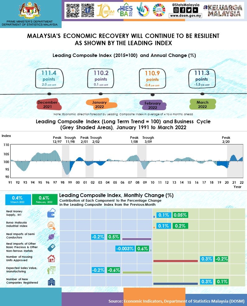 Malaysia's economic recovery will continue to be resilient. The level of the Leading Index (LI) continued to portray an upward trend by reaching 111.3 points in the reference month compared to 110.9 points in February 2022, increased by 0.4 per cent. The increase was primarily supported by Number of Housing Units Approved (0.3%) and Number of New Companies Registered (0.3%). However, the year-on-year LI slipped to negative 1.5 per cent in March 2022 mainly due to performance in Real Imports of Other Basic Precious & Other Non-ferrous Metals. Further analysis from a directional perspective, indicates that the short-term economy is expected to remain on the path of recovery. Although, rising commodity prices following the protracted global conflict led to a further decline in purchasing power to achieve a smooth and sustainable recovery.