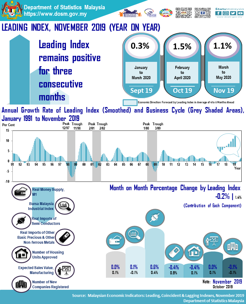 The Leading Index (LI) predicts the movement of the overall economic direction over the next few months registered an annual growth of 1.1 per cent in the reference month. However, the LI monthly growth rate decreased 0.2 per cent in November 2019 to 120.1 points from 120.3 points recorded in the previous month. The main components driving the 0.2 points shift were Real Imports of Other Basic Precious & Other Non-ferrous Metals and Number of Housing Units Approved which contributed negative 0.4 per cent, respectively. Despite a slight decrease in the month to month percentage change, the growth rate of LI (smoothed) remained above trend to show better economic momentum in the first five months of 2020.