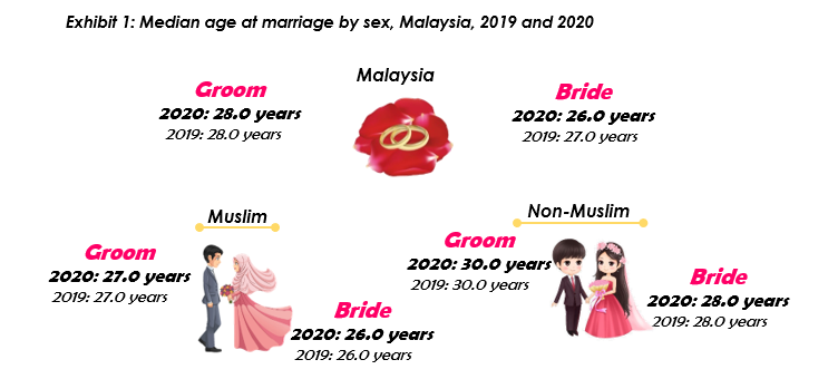 The median age of grooms remained at aged 28.0. Meanwhile, the median age for brides decreased from 27.0 years to 26.0 years. The median age of grooms and brides for Muslim and Non-Muslim remained unchanged.