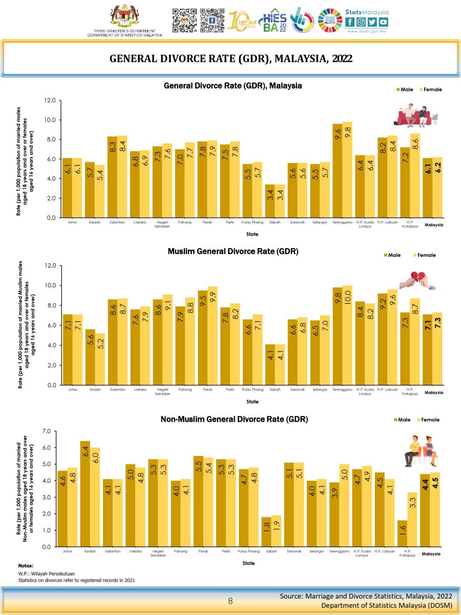 - The general divorce rate at national level for males improved to 6.1 from 6.7 per thousand population of married males aged 18 years and over. A similar trend was also reported for females, improved to 6.2 from 6.9 per thousand population of married females aged 16 years and over.