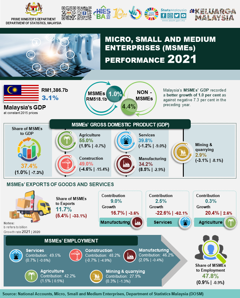 The full publication of Micro, Small & Medium Enterprises (MSMEs) 2021 can be downloaded through eStatistik portal.